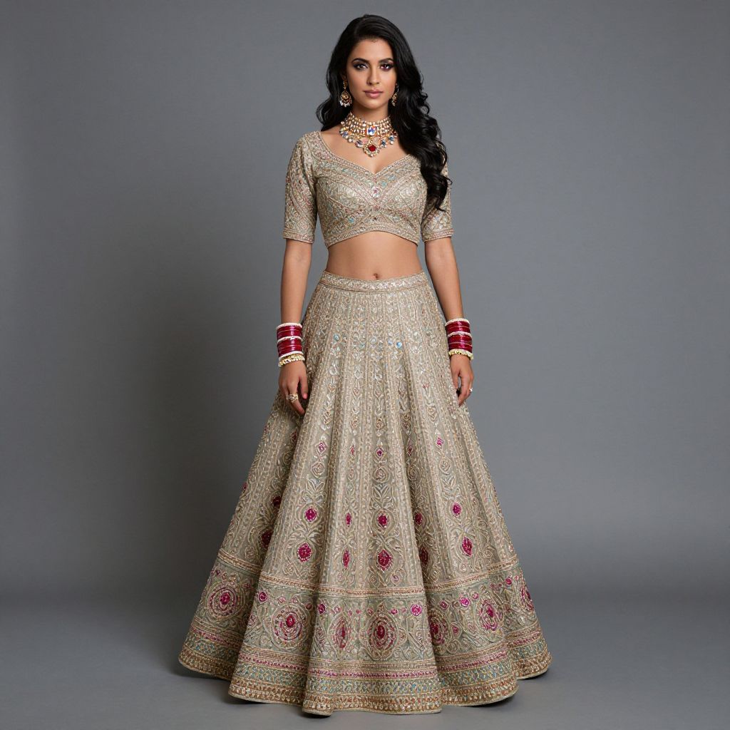 Fancy lehenga costume, 1girl, solo, dress, jewelry, bracelet, fine art parody, necklace, standing, full body, black hair