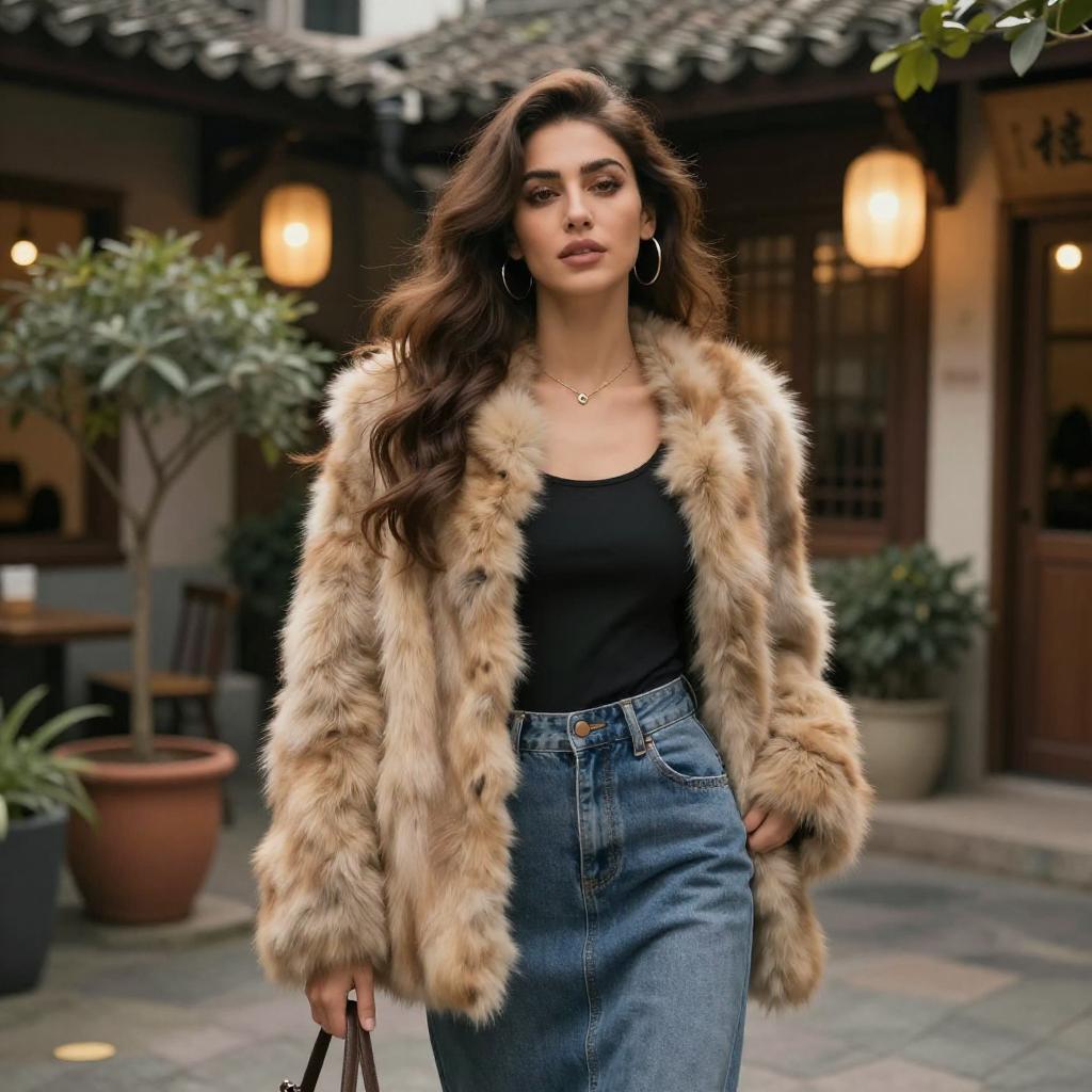 Photograph of a confident woman with long, wavy brown hair wearing a black tank top, high-waisted blue denim skirt, and a luxurious, tan-colored fur coat. She has hoop earrings and a delicate necklace. She stands outdoors in front of a traditional building with wooden doors and lanterns, potted plants, and tiled roofs. Her hands rest in her coat pockets, and she gazes directly at the camera with a calm, composed expression. The background is slightly blurred, emphasizing her as the focal point of the image.