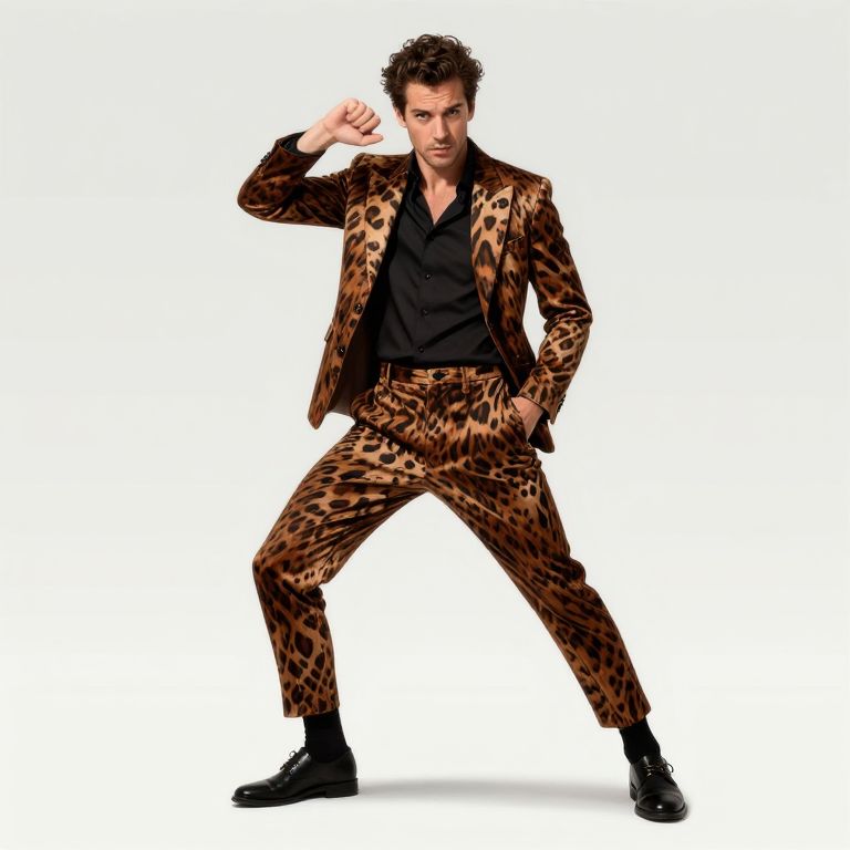 Photograph of a white man with short, curly brown hair, striking a powerful pose with his left arm raised and right arm bent. He wears a bold, leopard-print suit with a black dress shirt, no tie, and black shoes. His suit has a striking pattern of large brown and black leopard spots. The background is completely white, making the subject stand out prominently. His facial expression is intense and confident. The image has a high-contrast, studio-lit style, emphasizing the vivid colors and textures of the suit.