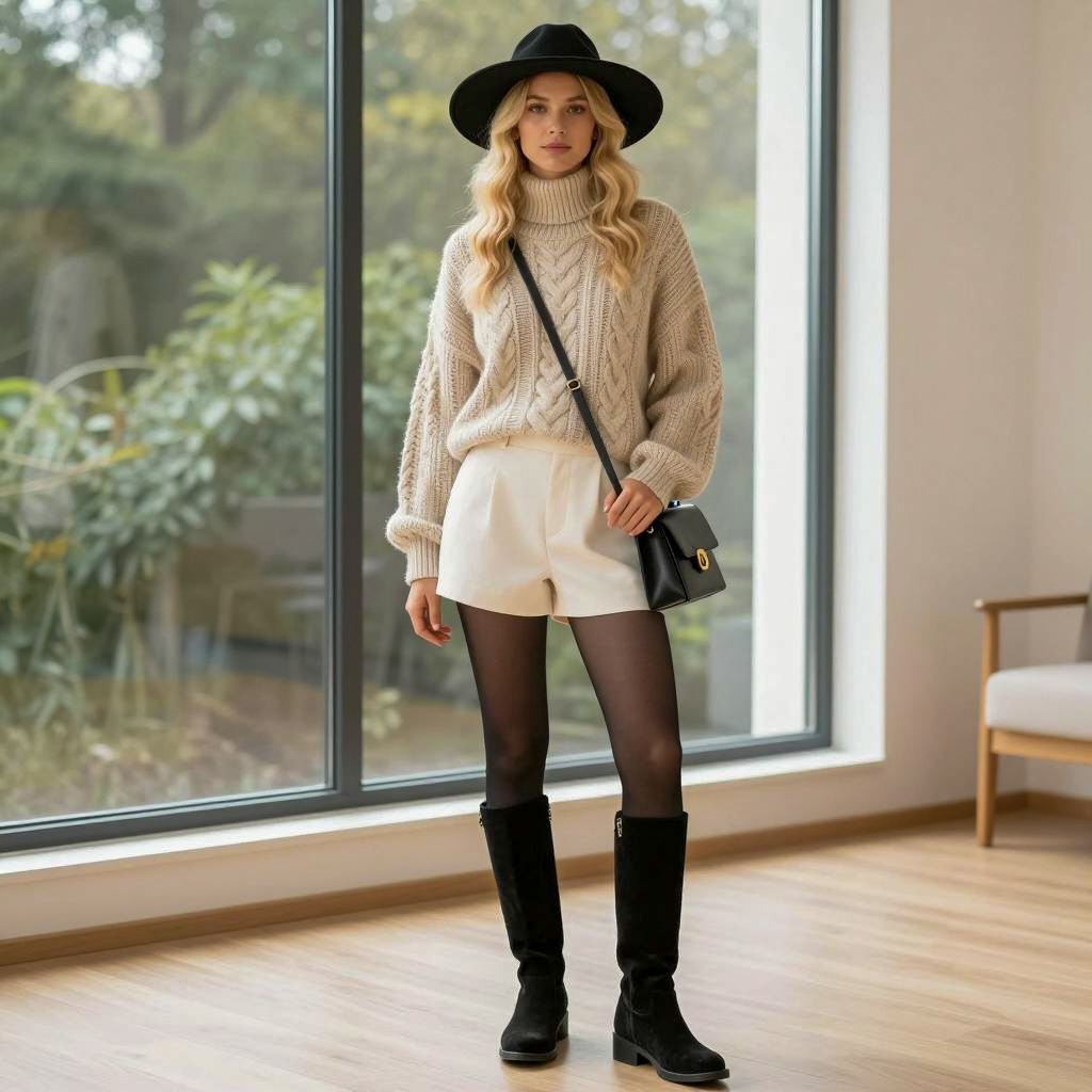 Blonde woman in photograph. Wearing white turtleneck sweater, white high-waisted pants, white coat, white cap, and white gloves. Holding white handbag with gold chain detail. Dark brick wall background. She stands upright, looking slightly to the side. Coat open, gloves visible. Coat pockets visible. Hands clasped in front. Red nail polish on fingers. Neutral facial expression. White and beige color palette. Overall minimalist, chic style.