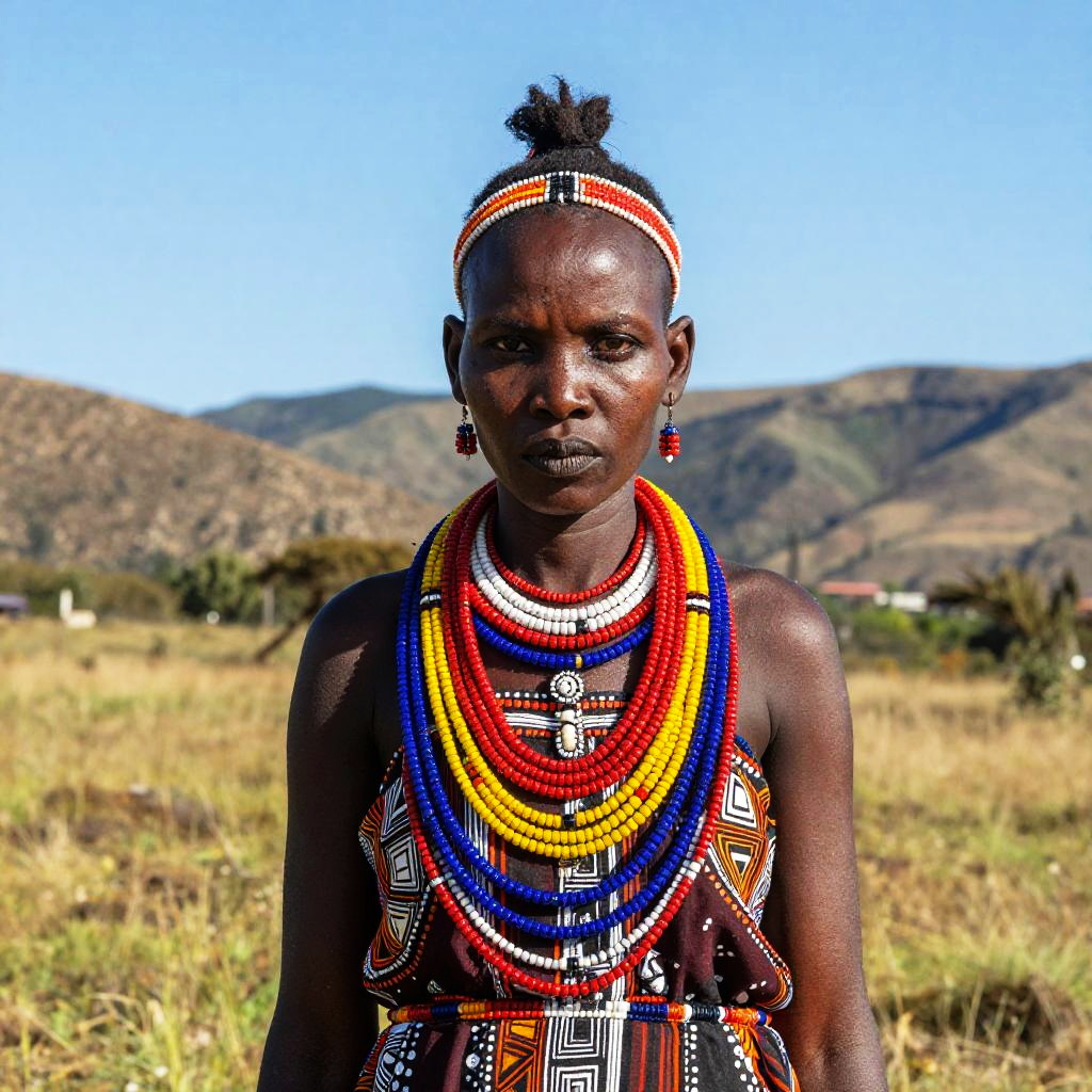 Picture of Cushite woman holding a clay pot, wearing a vibrant headwrap and ornate necklaces, in a traditional village scene filled with handmade crafts and rich earthy tones, the composition focused on her poised expression and the textures of her attire.