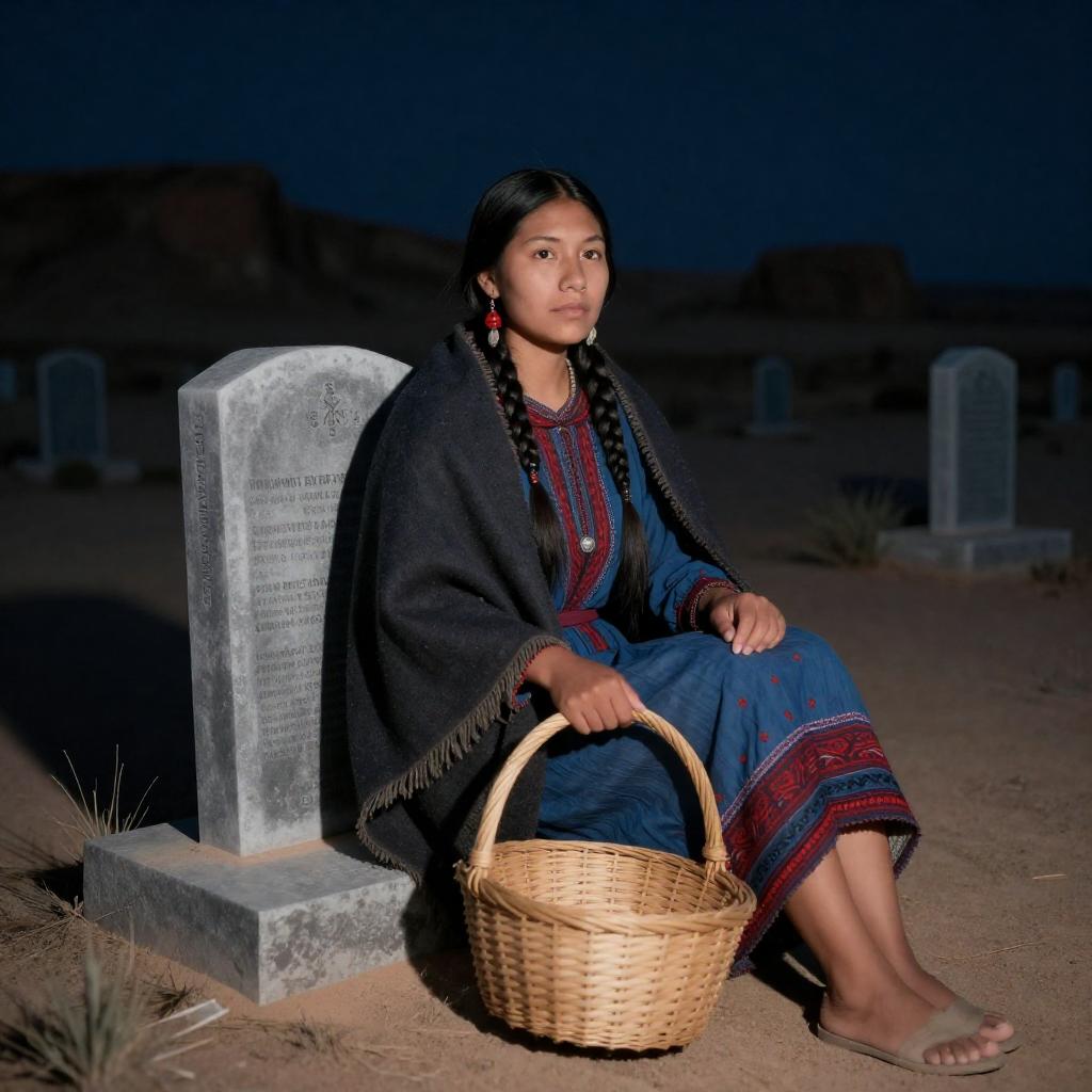 Young Native American woman with dark hair in a braid, wearing a dark blanket and a blue dress with red patterns, sits against a grave marker in a dimly lit desert at night. She holds a woven basket and gazes forward. Grave markers and rocky terrain are in the background.