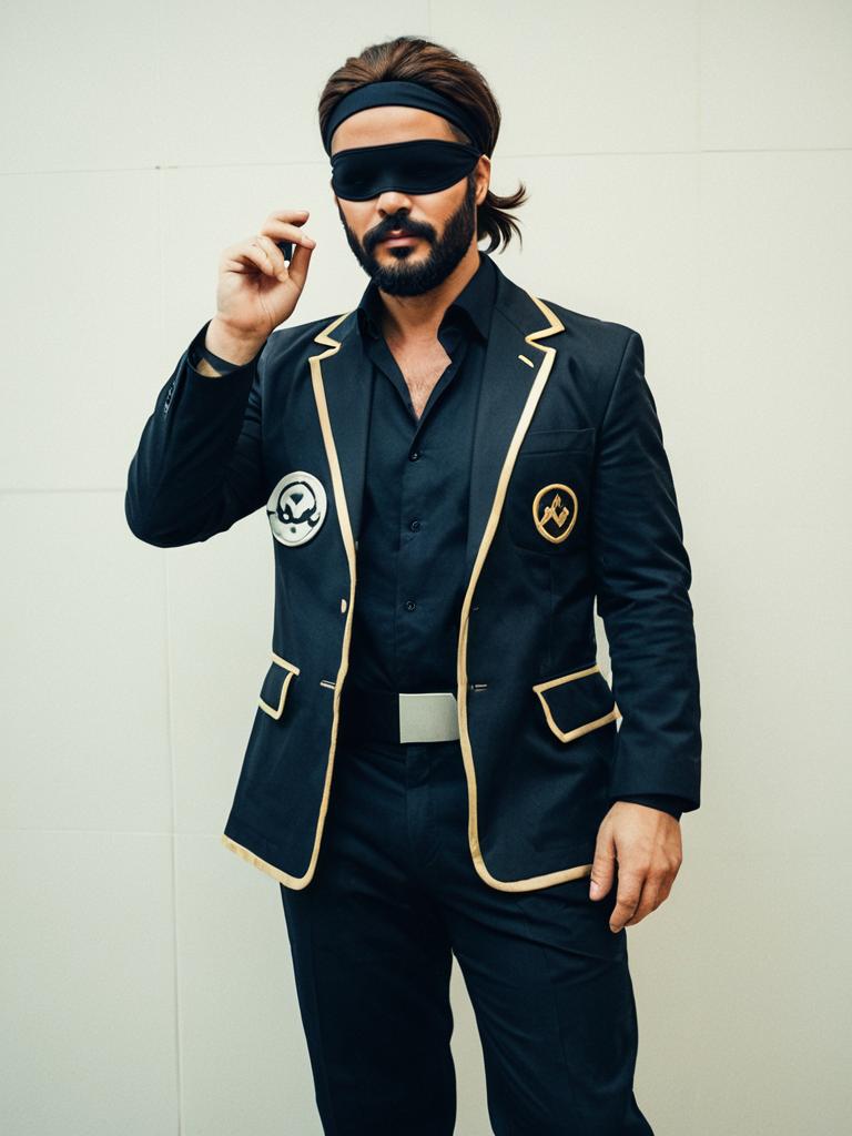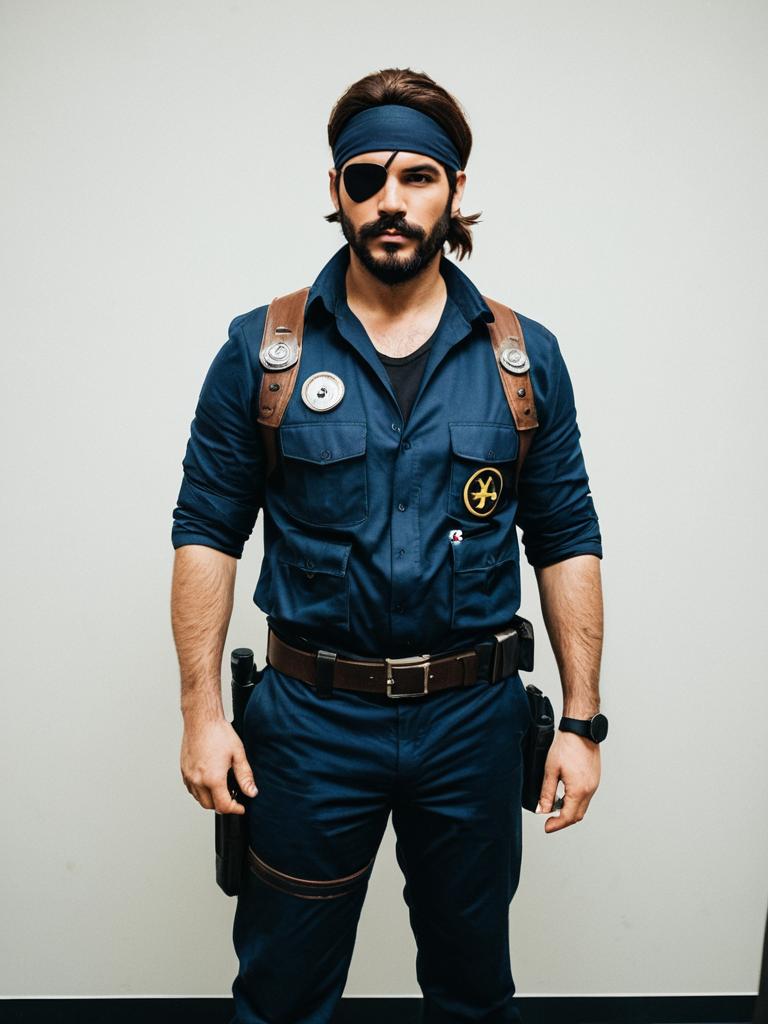 A full-body photo-realistic image of a male cosplayer dressed as Big Boss, a character from the Metal Gear series. The man has brown hair, a beard, and a mustache. He is wearing a dark blue tactical outfit with a matching headband and an eye patch over his right eye. The costume includes detailed accessories like a belt, holsters, and patches on the chest.