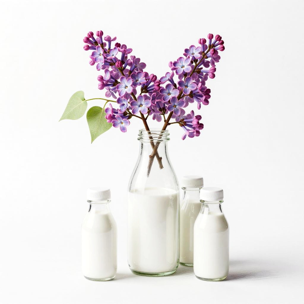 A subtle hand-drawn pencil sketch featuring an old-fashioned glass milk bottle holding a cluster of lilac blossoms with delicate leaves, on a seamless white background with three small empty white bottles nearby; high contrast, bold accent colors, thin clean lines, balanced composition, generous negative space, soft studio lighting, modern minimalist aesthetic, crisp edges, no text, no watermark