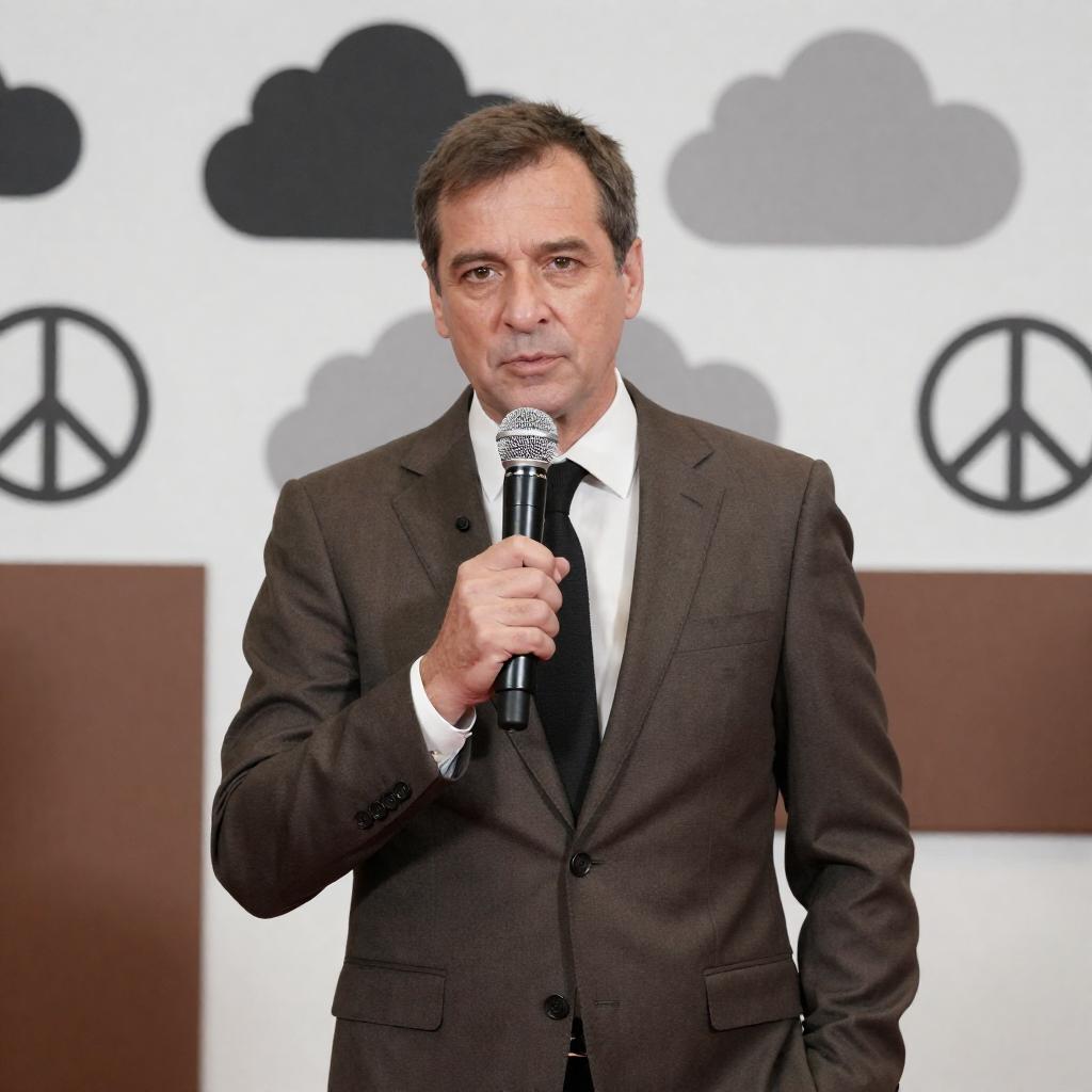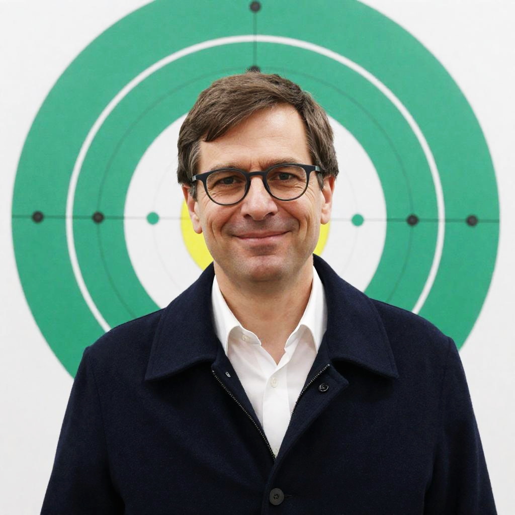 Photograph of a middle-aged white man with short brown hair and glasses, smiling slightly. He wears a dark, ured coat over a white shirt. Green target reticle with concentric circles and green dots in the background. His face is centered, slightly angled to the left.