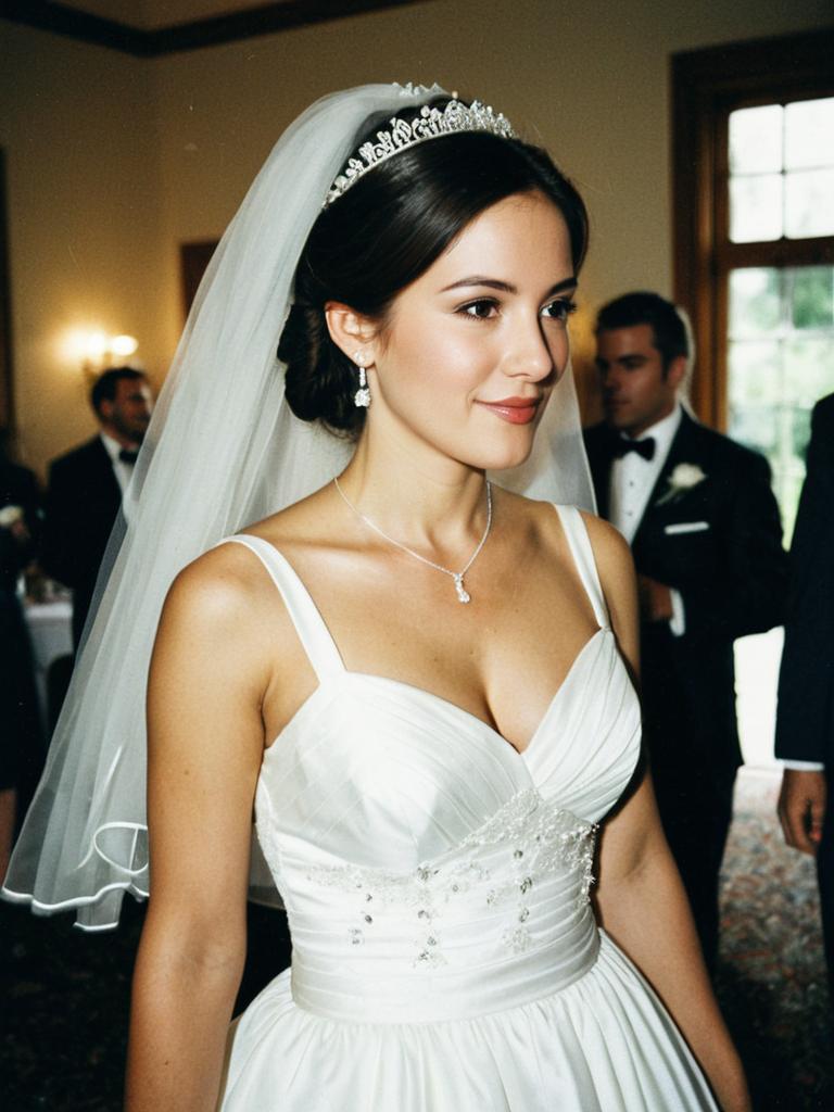 Portrait of a smiling young bride with dark hair styled up, wearing a white wedding dress adorned with delicate embroidery and beadwork. She is accessorized with a pearl necklace, drop earrings, and a sheer veil, standing indoors at a wedding venue with soft, warm lighting.