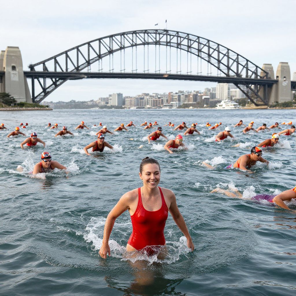 Photograph of a smiling woman in a red one-piece swimsuit, raising her hand, surrounded by many swimmers in red caps, under Sydney Harbour