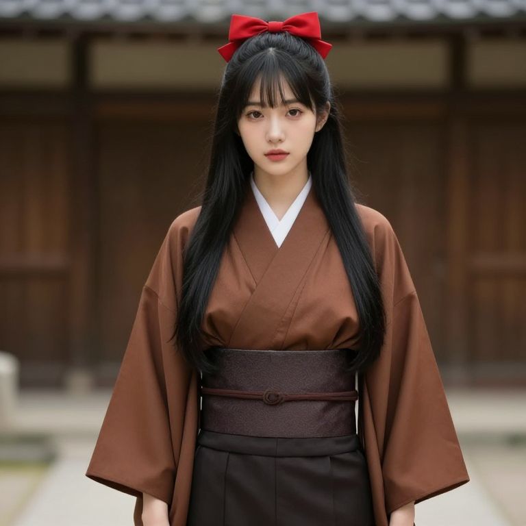 Female wearing a brown kimono with a brown belt and black pants. She has long black hair with a red bow at the top.