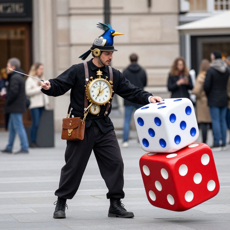 A street performer, a fusion of bird and clockwork, manipulates oversized dice that roll time instead of numbers.