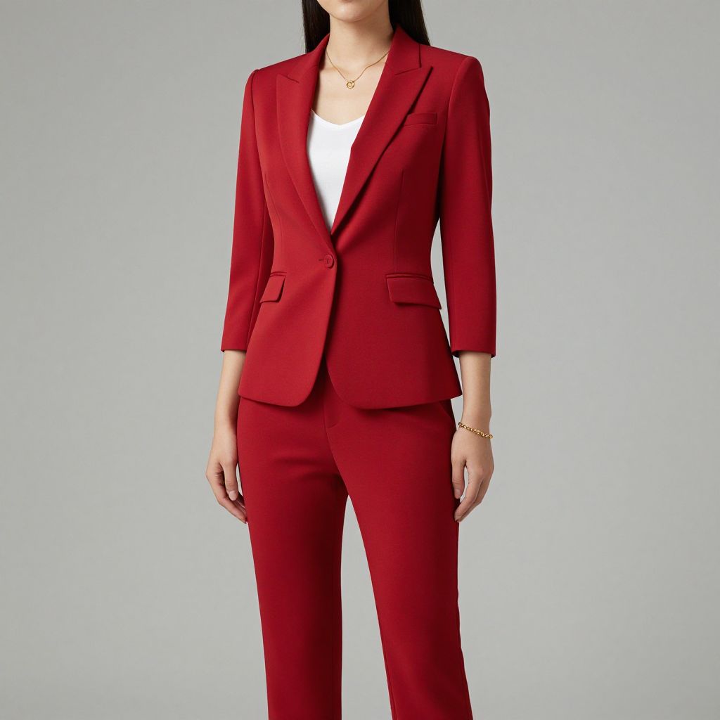 Elegant woman showcasing a high-quality, slim-fitting red professional pantsuit featuring a tailored blazer jacket and matching trousers, accessorized with a gold necklace and bracelet against a neutral background.
