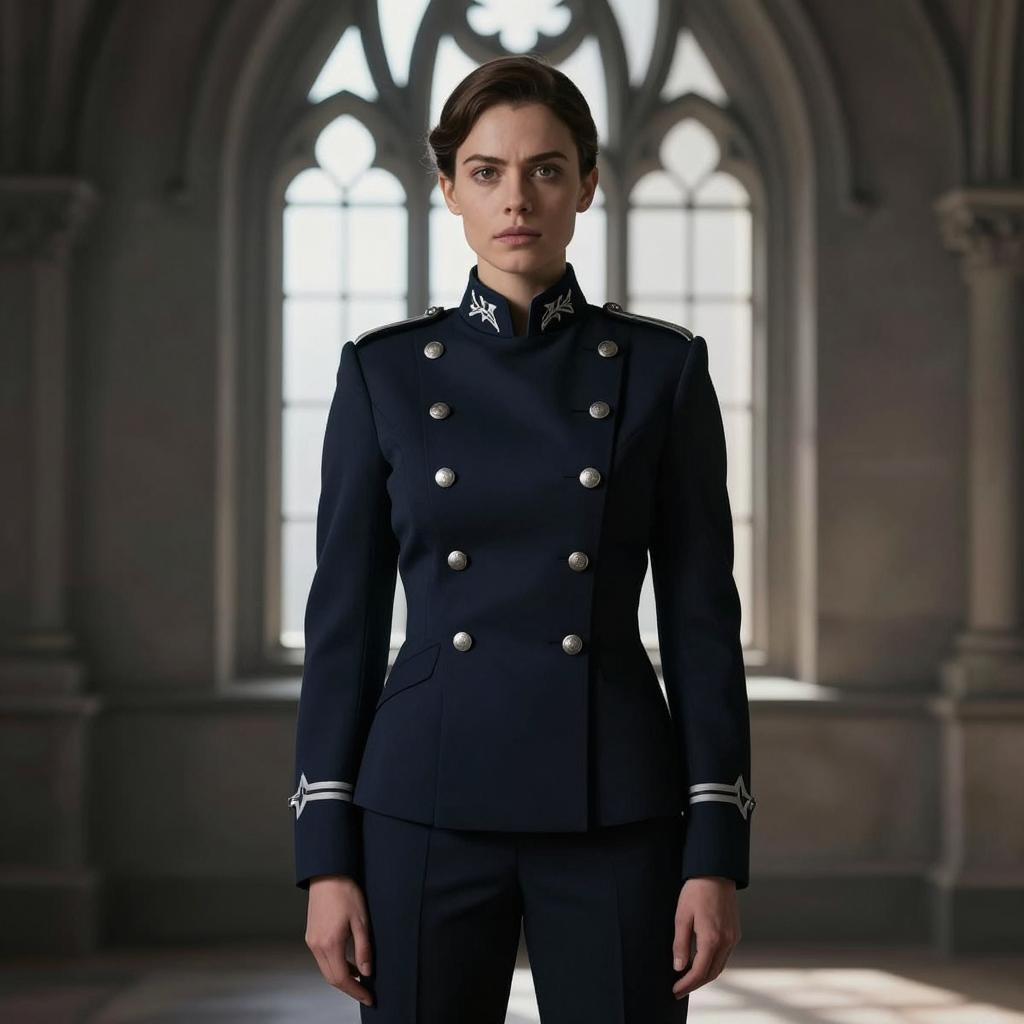 Portrait of a young woman with green eyes and brown hair braided, wearing a vintage brown military-style cap featuring an eagle emblem. She is dressed in a dark green sleeveless military vest with silver buttons and red insignia on the epaulets, paired with a white button-up shirt. The setting is indoors with muted background colors and a subtle depth of field, highlighting the serious expression and realistic detailed textures of the uniform.