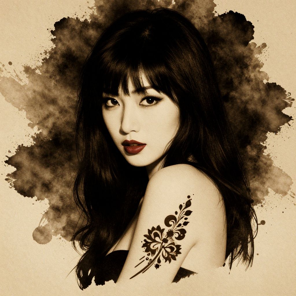 Sepia-toned digital portrait of a dark-haired woman with bangs, red lipstick, floral tattoo on right shoulder, against a splattered black background