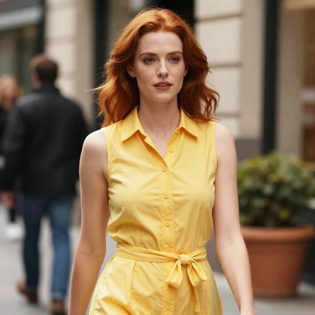 Photograph of a fair-skinned woman with wavy, shoulder-length red hair. She's wearing a yellow, sleeveless, button-up dress with a bow at the center and a waist tie. She has a focused expression and is standing in front of a blurred urban background with a person walking by and a potted plant on the right. The lighting is natural, highlighting her features and dress.