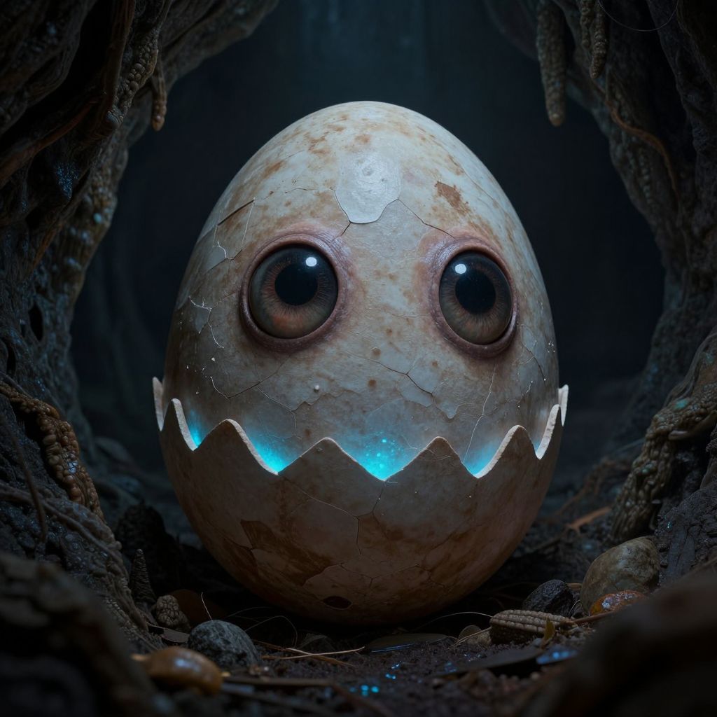 Digital artwork of a creepy, cracked egg with glowing blue teeth and wide, black eyes, set in a dark, rocky cave.