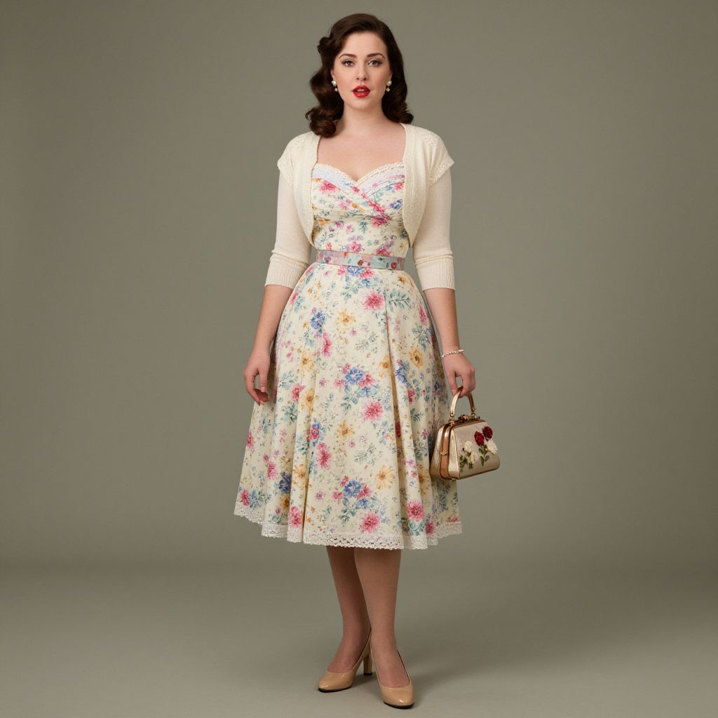Full body shot, woman, vintage inspired dress, tea-length silhouette, soft cotton fabric, delicate floral print, fitted bodice, flared skirt, cap sleeves, lace trim, cinched waist with a satin ribbon, retro polka dots, pastel color palette, matching cardigan, vintage leather pumps, pearl necklace, classic handbag, subtle makeup, wavy hairstyle, nostalgic vibe Sexy. Pretty face and beаutiful eyes. Big breasts