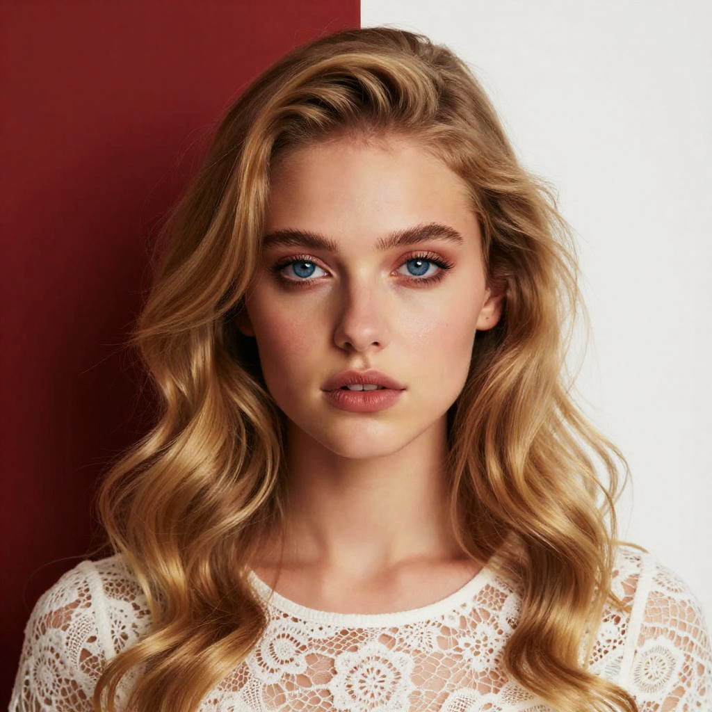 Photograph of a woman with strikingly contrasted features. Her face is split vertically down the middle, showcasing half with dark brown, wavy hair and half with blonde, curly hair. She has blue eyes, red lipstick, and a serious expression. Her skin is fair, and she's wearing a light-colored top. The background is blurred and neutral. The image has a dramatic, surreal effect.