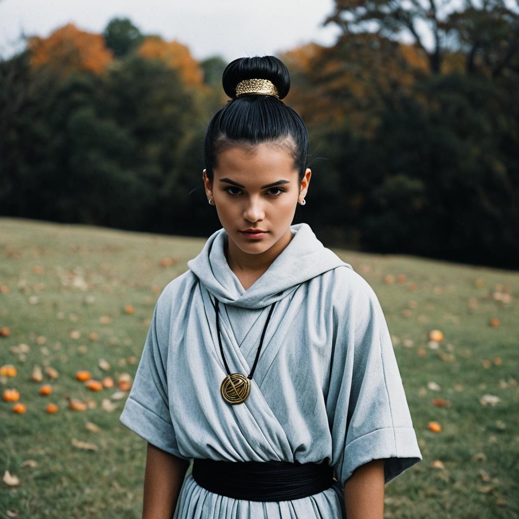 A young man with black hair styled in a high bun wearing a grey Rey-inspired Halloween costume with a black belt and a pendant necklace. He is standing outdoors in a grassy area with scattered pumpkins in the background, surrounded by trees with autumn foliage.