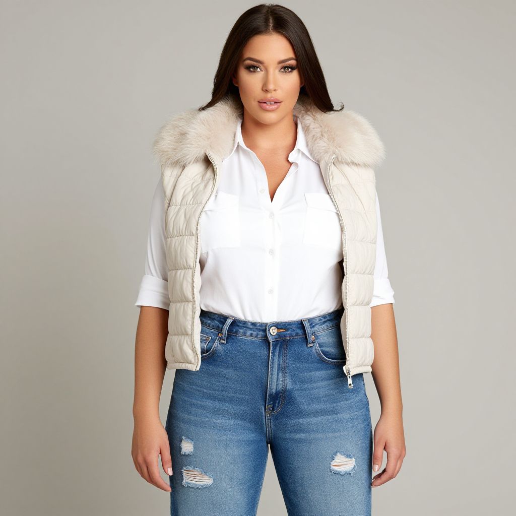 "Woman, casual, light beige quilted vest, zipper detail, fur-trimmed collar, sleeveless, white button-up shirt, distressed blue denim jeans with ripped knees, mid-rise, straight-leg cut. Sexy. Pretty face and beаutiful eyes. Big breasts."
