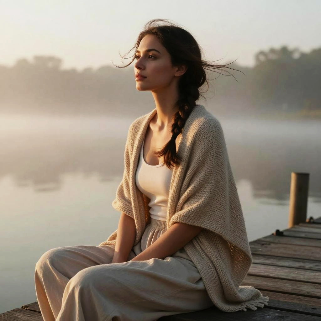 (masterpiece:1.1), best quality, (photorealistic:1.2), hyperrealistic, award-winning portrait of woman in early 30s, dark brown braided hair, serene expression, upper body, expressive eyes, slim wai BREAK 1.1, wide hips:1.1, athletic-curvy build, wind-swept hair, sitting in foggy lakeside pier at sunrise, wearing knitted shawl and linen trousers, golden hour glow, dappled light, soft particles in the air, 8k, highly detailed, broad lighting, chromatic aberration, subtle film grain, ray tracing, octane render, soft bloom