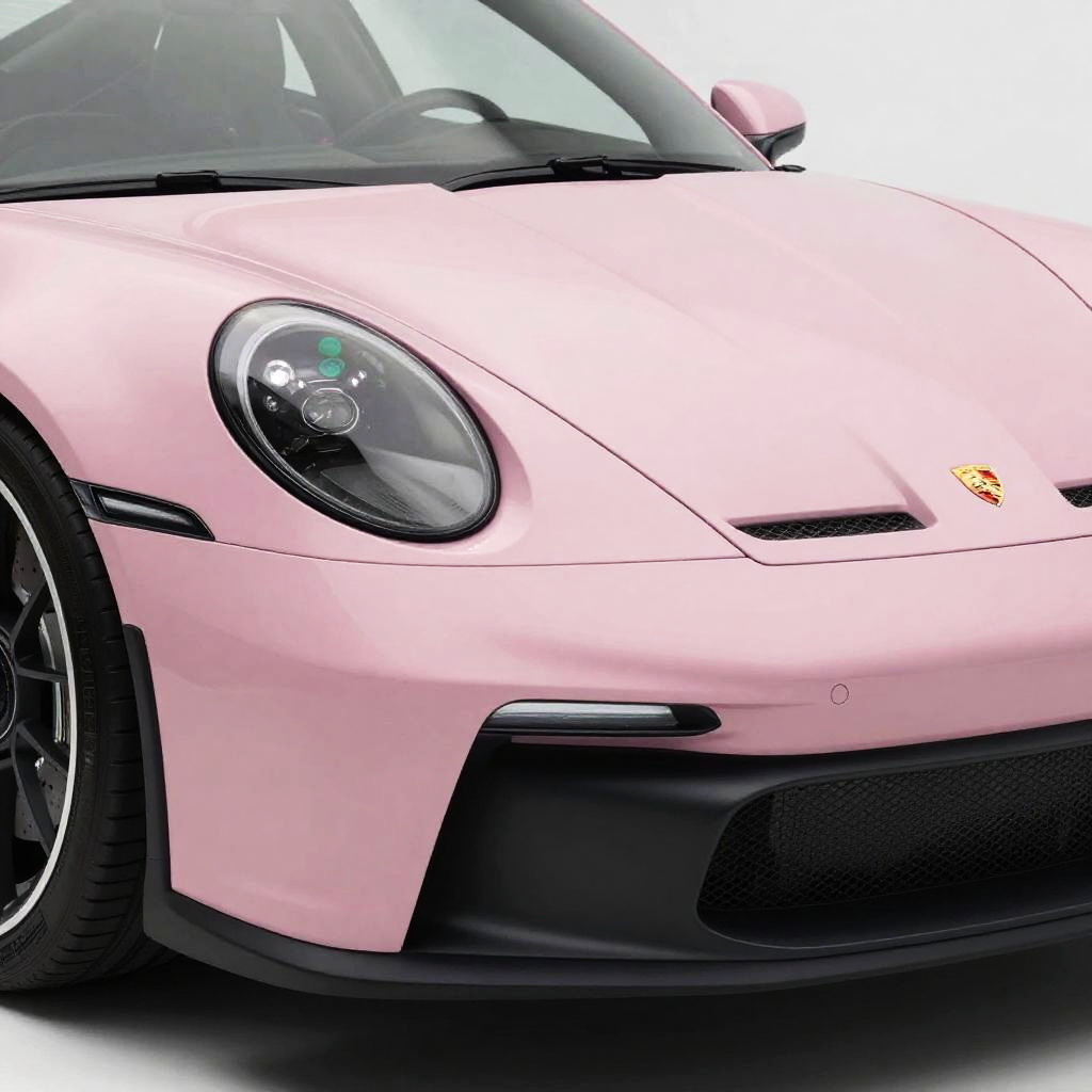 Modern Porsche frog eyes close-up, front view with glossy black finish and prominent round headlights, wet asphalt street reflection, rain droplets on the car surface, moody evening lighting, hyper-realistic style with cinematic flare