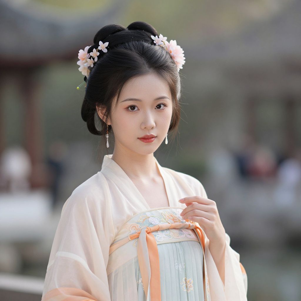 A graceful 1800s Chinese woman in a beautifully detailed pastel robe stands amidst delicate flowers, exuding elegance and grace.