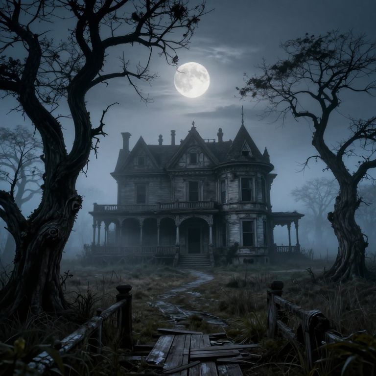 Imagine an enchanting landscape reminiscent of Salvador Dali's surrealistic visions and Edgar Allan Poe's captivating Gothic atmosphere. In this haunting scene, a decrepit Victorian mansion stands alone amidst a foggy marsh at twilight, captured by the camera from an elevated vantage point. The dilapidated estate contrasts starkly with gnarled, twisted trees forming a sharp contrast against the ethereal fog that envelops the eerie landscape. Ghostly shadows play across weathered walls and creaking floorboards, suggesting forgotten secrets within. A full moon rises in the background, its silvery light casting an otherworldly glow over the scene, almost inviting those who dare to step into this mysterious realm of intrigue and wonder.