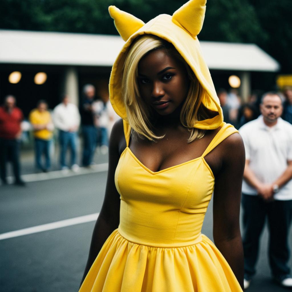 Portrait of a dark-skinned woman with blonde hair wearing a bright yellow dress with a skirt and a hood featuring cat ears. She is standing outdoors with a blurred crowd in the background, looking directly at the camera.