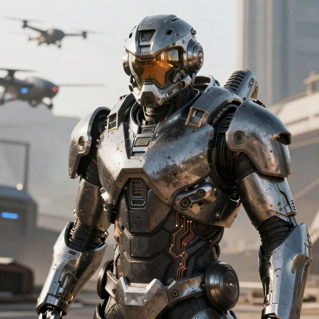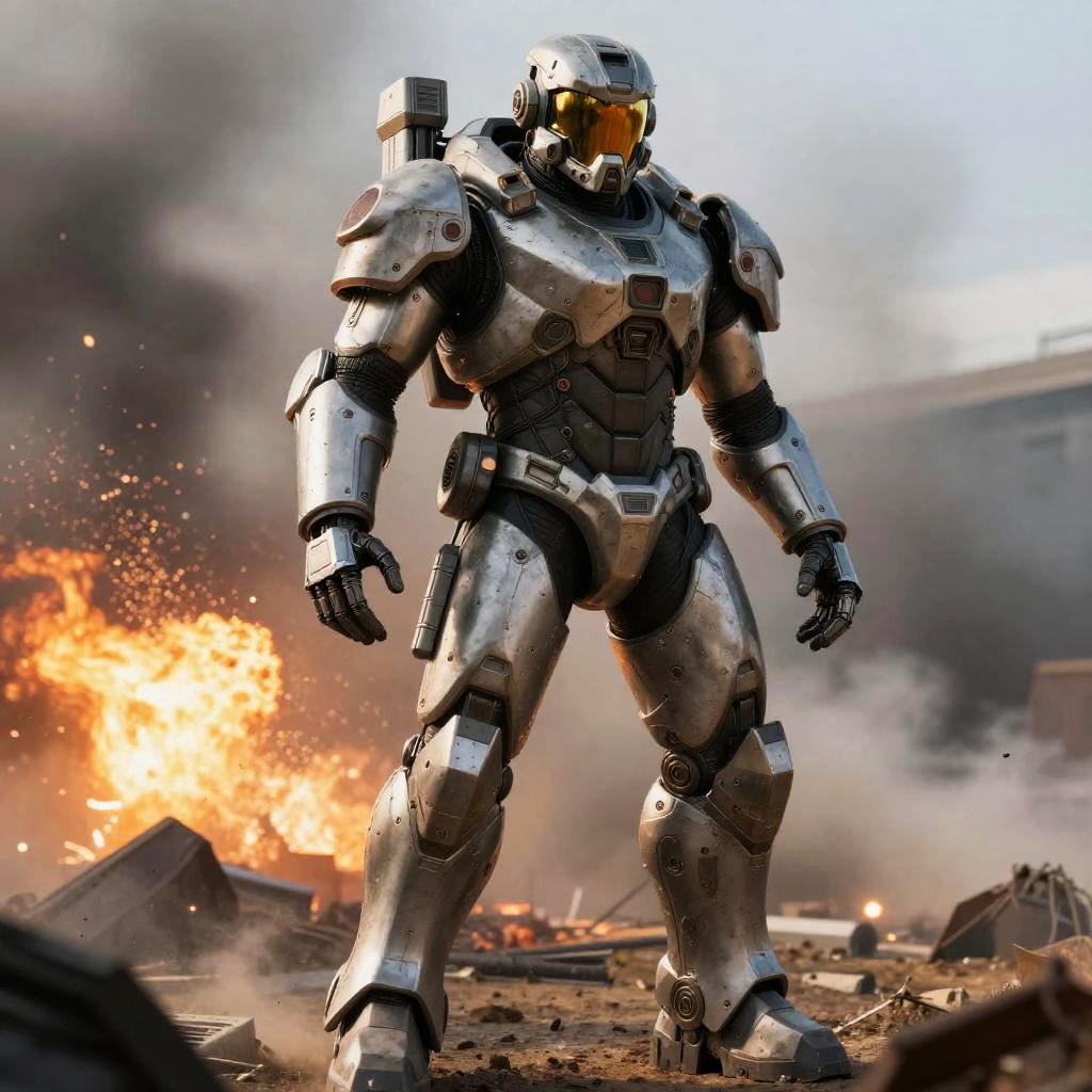 Crytek-style armored soldier in a high-tech exosuit, standing on a battlefield with explosions and smoke in the background, intense action scene, intricate mechanical details, photorealistic rendering with dramatic lighting.