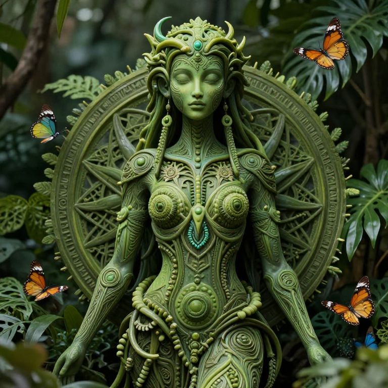 A detailed, digital CGI image of a green, intricately carved, statuesque female figure with East Asian-inspired features and ornate jewelry. She has closed eyes, small breasts, and a serene expression. Her elaborate headdress and circular, patterned backdrop resemble a mandala. She wears a beaded loincloth and necklace with a large turquoise pendant. Vibrant orange and black butterflies with blue highlights flutter around her. The lush, green jungle background with large leaves adds a natural, mystical ambiance to the scene. The overall style is highly detailed and fantasy-inspired, blending realism with mythological elements.