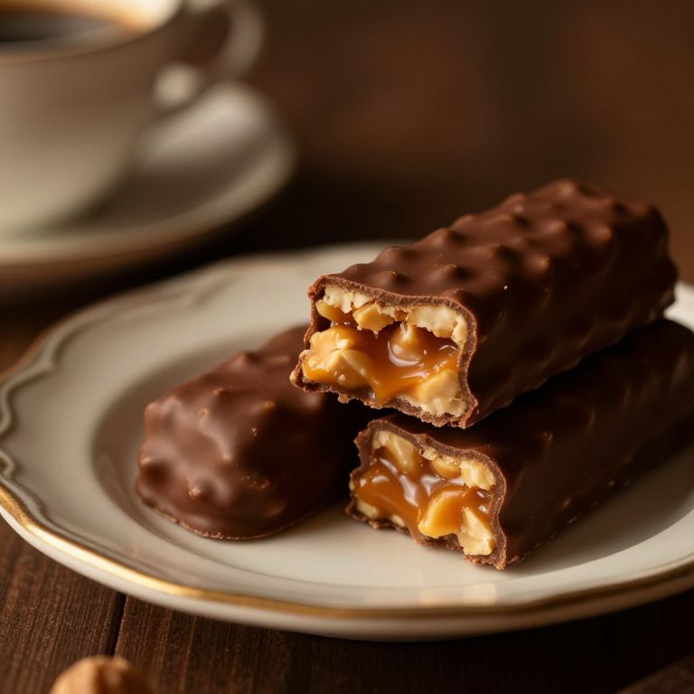 Snicker candy bar cut open revealing layers of nougat, caramel, and peanuts, placed on a vintage plate with a cup of coffee, moody warm lighting that casts gentle shadows, photographic realism capturing the intricate texture and glossiness of the chocolate coating.