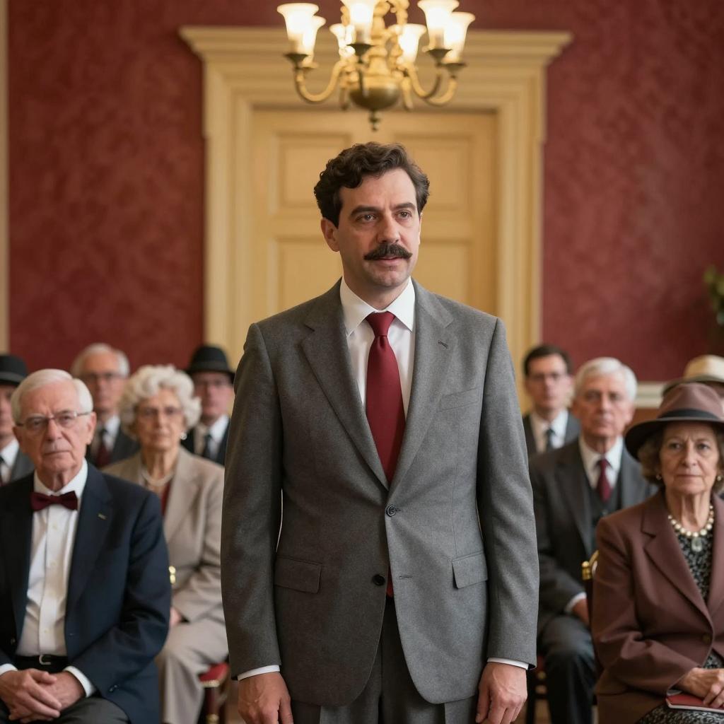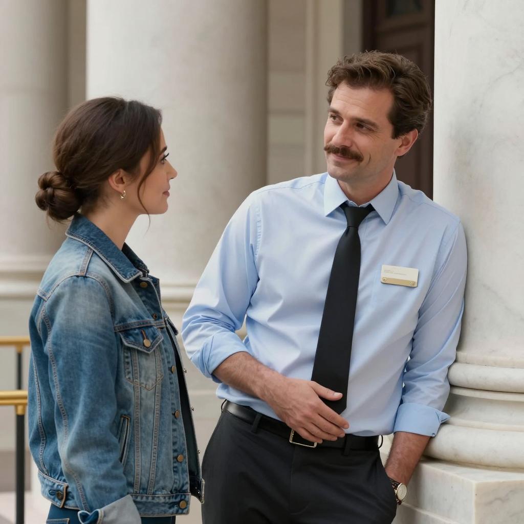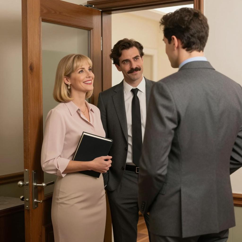 Three people in a wooden doorframe. Woman with blonde bob, pink blouse, beige skirt, holding black book, smiling. Man in gray suit, white shirt, black tie, mustache, looking at woman. Man in gray suit, blue shirt, back to camera, facing other man. Door has metal handles, mirror reflection. Warm indoor lighting.