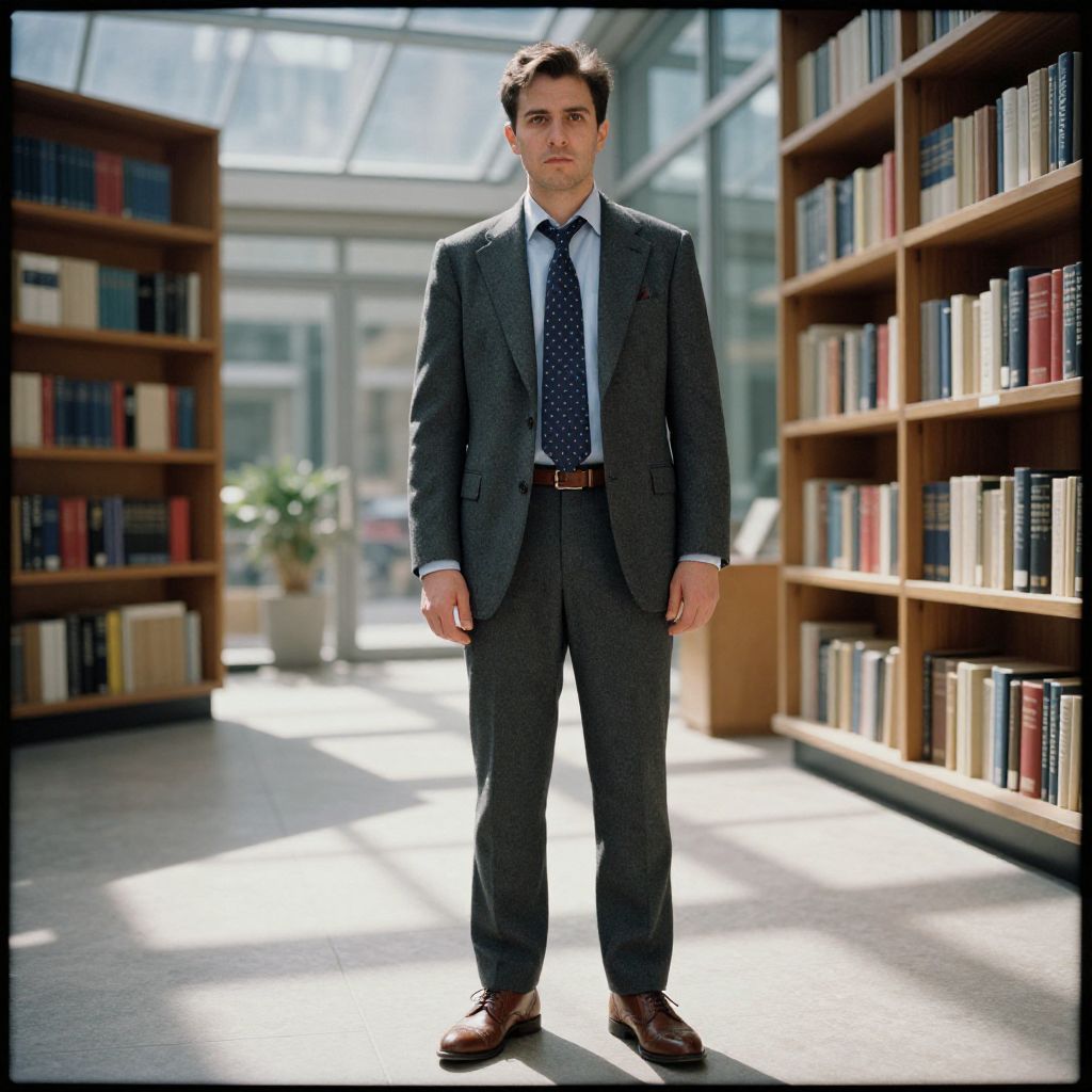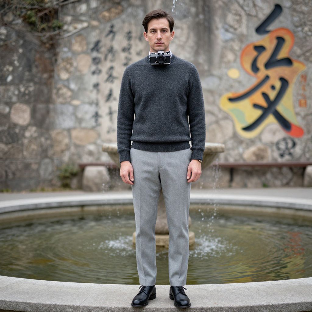 A man, charcoal merino wool sweater, light gray tailored trousers, black leather derbies, ancient stone walls, vibrant calligraphy, peaceful fountain, Holga camera style, soft focus, contemplative expression. Man has masculine face and piercing eyes
