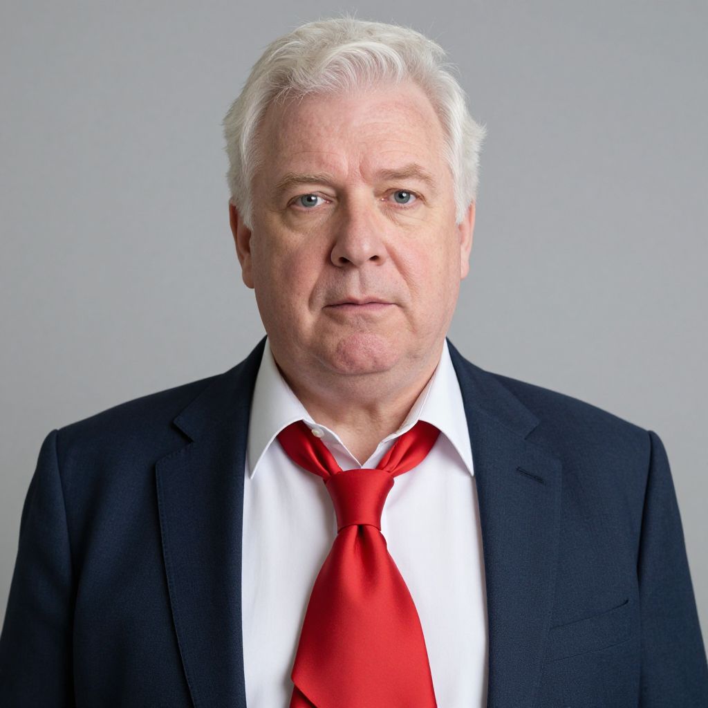 Photograph of a middle-aged white man with white hair, wearing a black suit, white shirt, and bright red tie, against a plain gray background