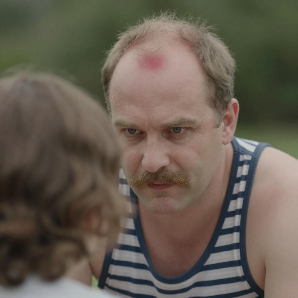 Photograph of a middle-aged Caucasian man with receding blond hair and a mustache. He has a prominent red mark on his forehead and is wearing a navy and white striped tank top. The man is leaning closely towards another person with wavy brown hair, whose face is not visible. The background is natural and blurred, suggesting an outdoor setting.