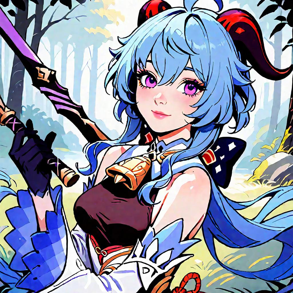 Score_9, score_8_up, score_7_up, source_anime, ganyu, blue hair, goat horns, horns, long hair, purple eyes, sidelocks, smile, gloves, bare shoulders, detached sleeves, black gloves, bell, bodysuit, neck bell, black bodysuit, vision \(genshin impact\), bodystocking, cowbell, chinese knot, outdoors, forest, nature, looking at viewer, weapon, bow \(weapon\), holding bow \(weapon\), drawing bow