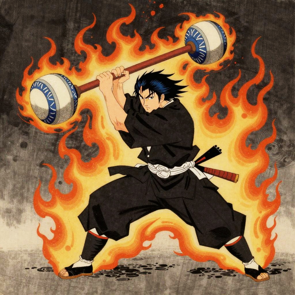 Ukiyo e oni in a dramatic battle pose, wielding a giant kanabo club, surrounded by swirling flames and wind, authentic brush strokes, rich saturated colors in woodblock style