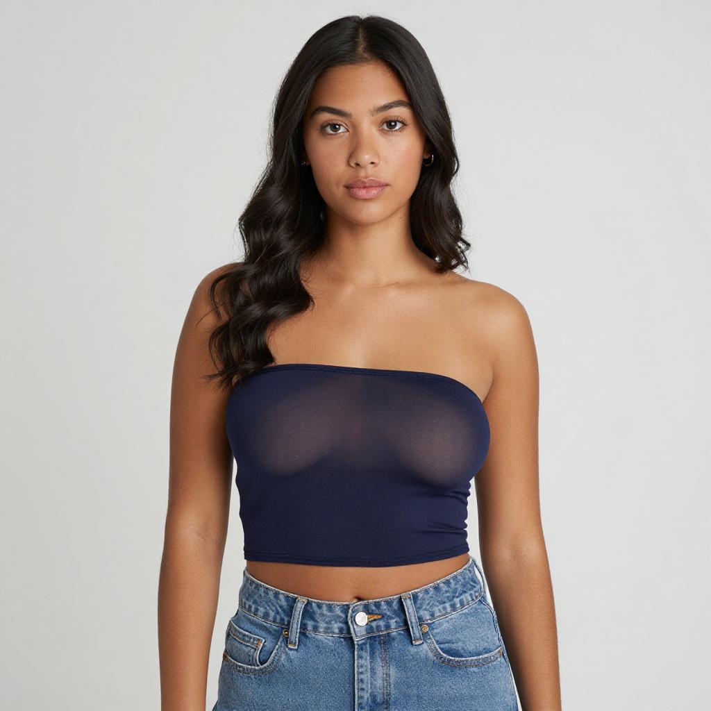 Photograph of a slender, blonde woman with long, wavy hair wearing black denim overalls with side straps. She stands with one hand on her hip, looking confidently to the side. She has large hoop earrings and a subtle smile. The background is stark white, creating a high-contrast effect.