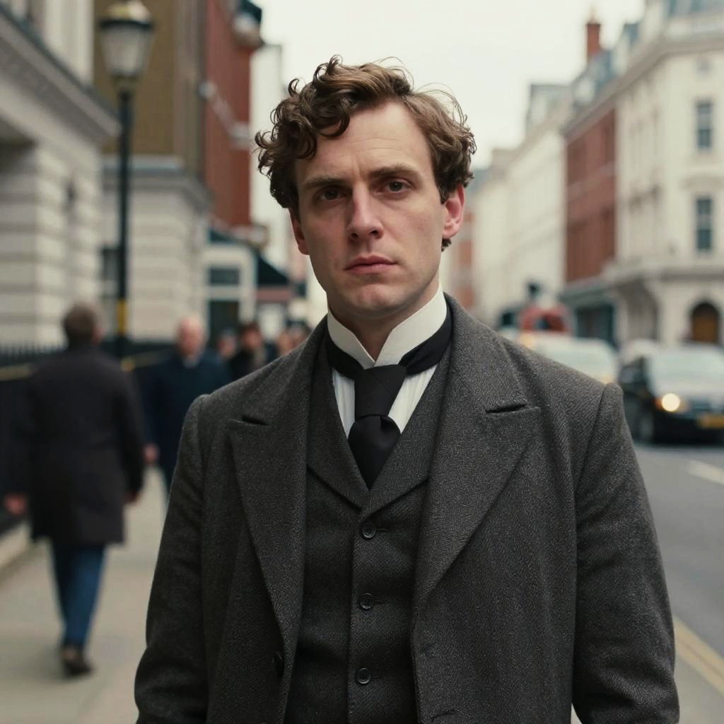 Victorian man, London, (sharp focus:1.2), extremely detailed, (photorealistic:1.4), (RAW image, 8k high resolution:1.2), RAW candid cinema, 16mm, color graded Portra 400 film, ultra realistic, cinematic film still, subsurface scattering, ray tracing, (volumetric lighting)