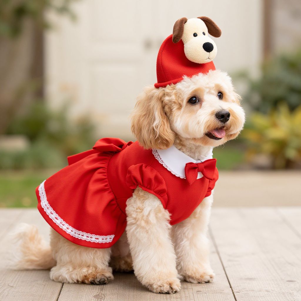 Cute fluffy beige puppy in a red dress with a matching hat and bow, standing outdoors on a wooden deck.