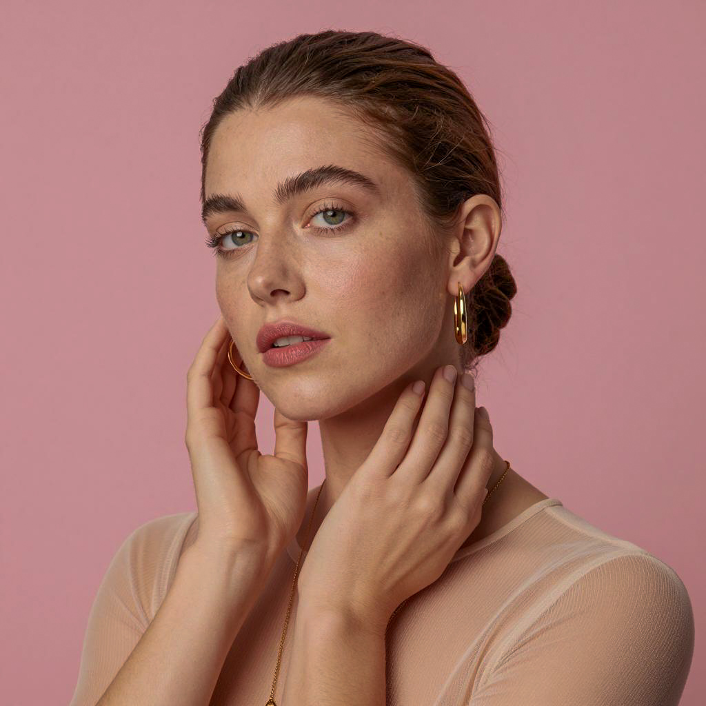 Photograph of a woman with blue eyes, pink eyeshadow, and pink lipstick. She has curly brown hair, wears gold hoop earrings, and touches her head with one hand. She has a light beige, ured top. Her expression is slightly open-mouthed. Background is white and out of focus.