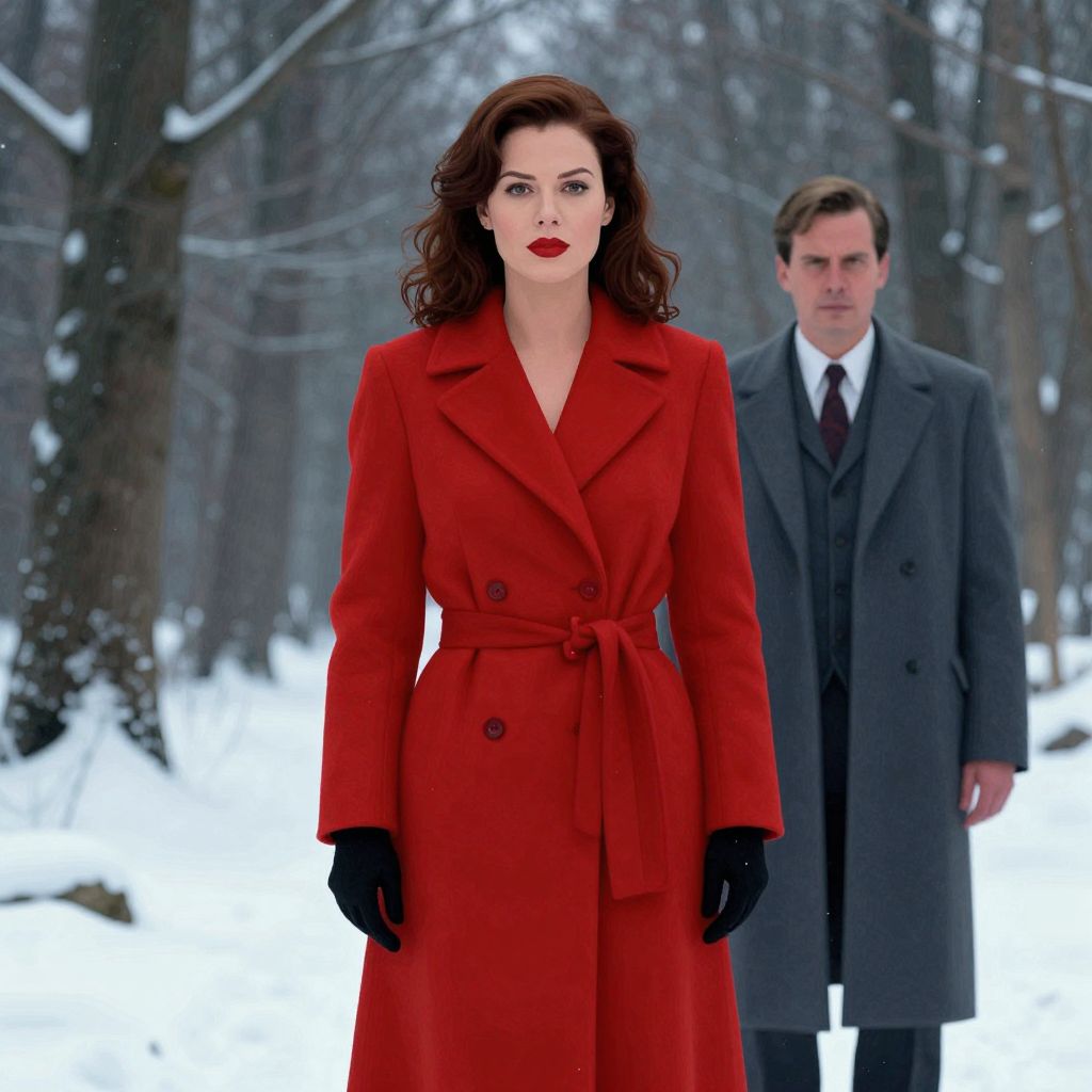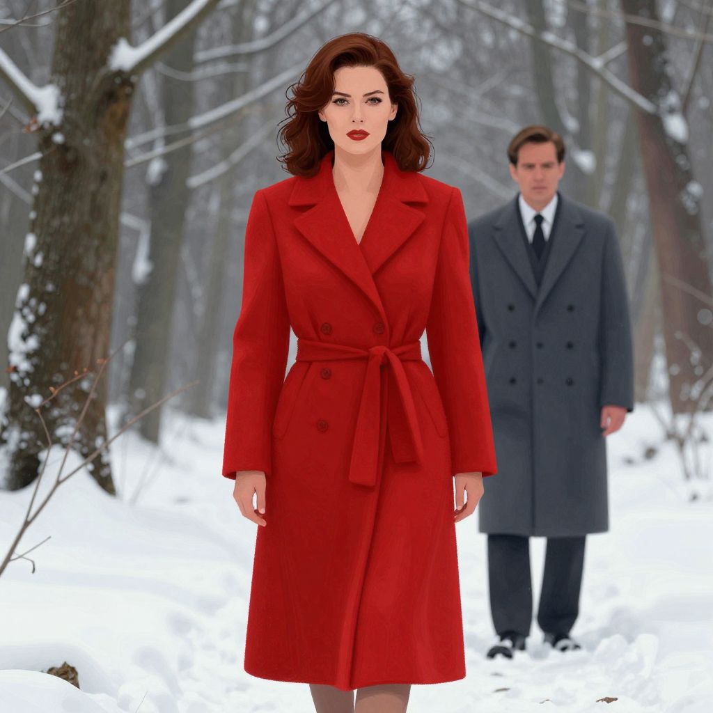 A striking digital illustration depicts a woman in a vibrant red coat standing prominently in a wintry forest, her bold presence contrasted by a man in a gray overcoat, rendered in a cinematic, high-definition style reminiscent of classic film noir aesthetics.