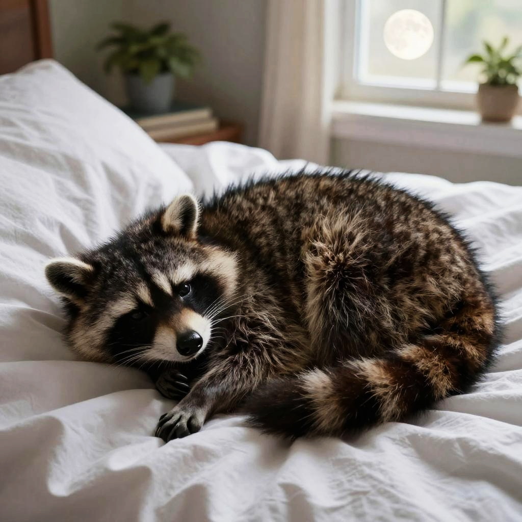 Fantasy scene of a raccoon sleeping in bed, surrounded by glowing fireflies, magical forest-themed room, soft cushions and a wooden canopy bed, warm ambient light with sparkles in the air, enchanting and peaceful nocturnal vibe