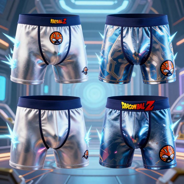 Futuristic Dragon Ball Z underwear collection with capsule corp logos, metallic textures, and glowing energy blasts bursting from the fabric in a high-tech anime scene.