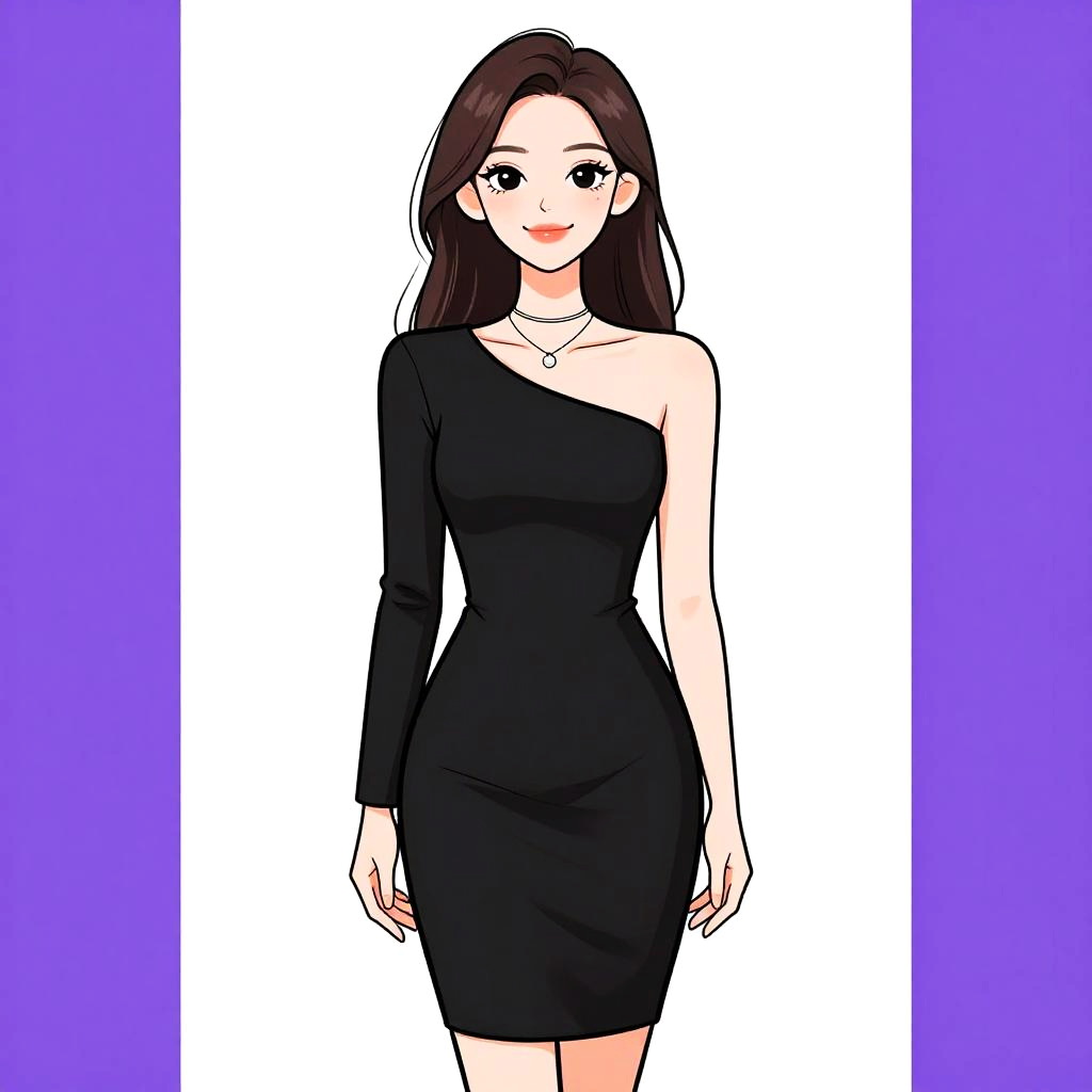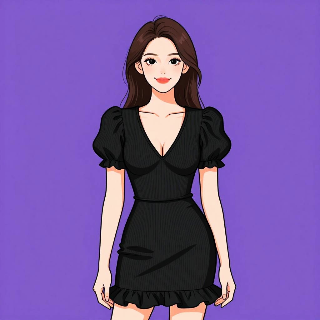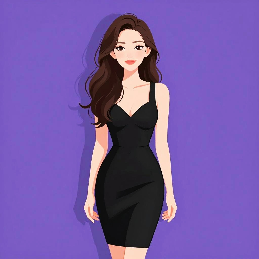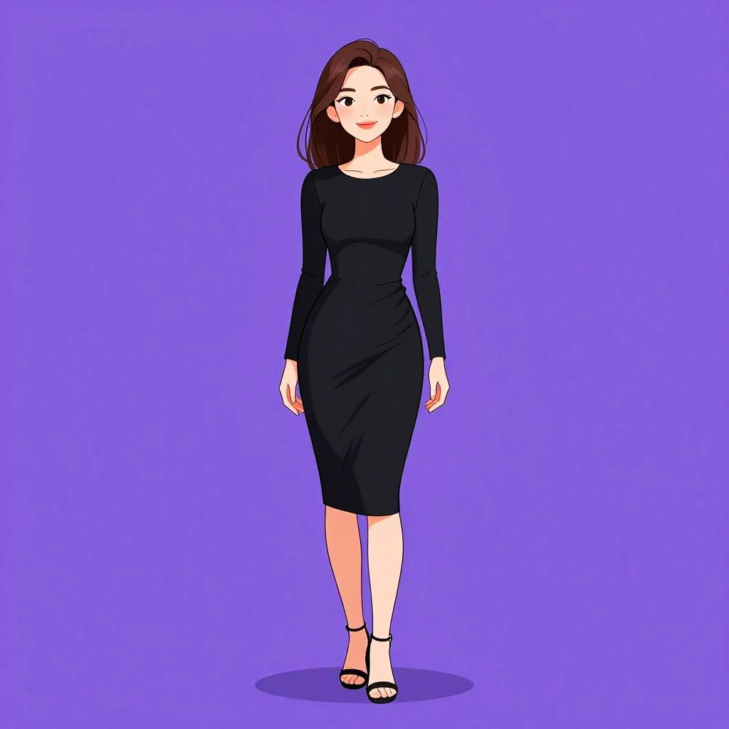 Digital illustration of a woman with long wavy black hair wearing a modern minimalist black bodycon dress. The dress features a high neck, sleeveless design, and fitted silhouette reaching knee-length. The woman has a pretty face with simple makeup and poses against a solid purple studio background.