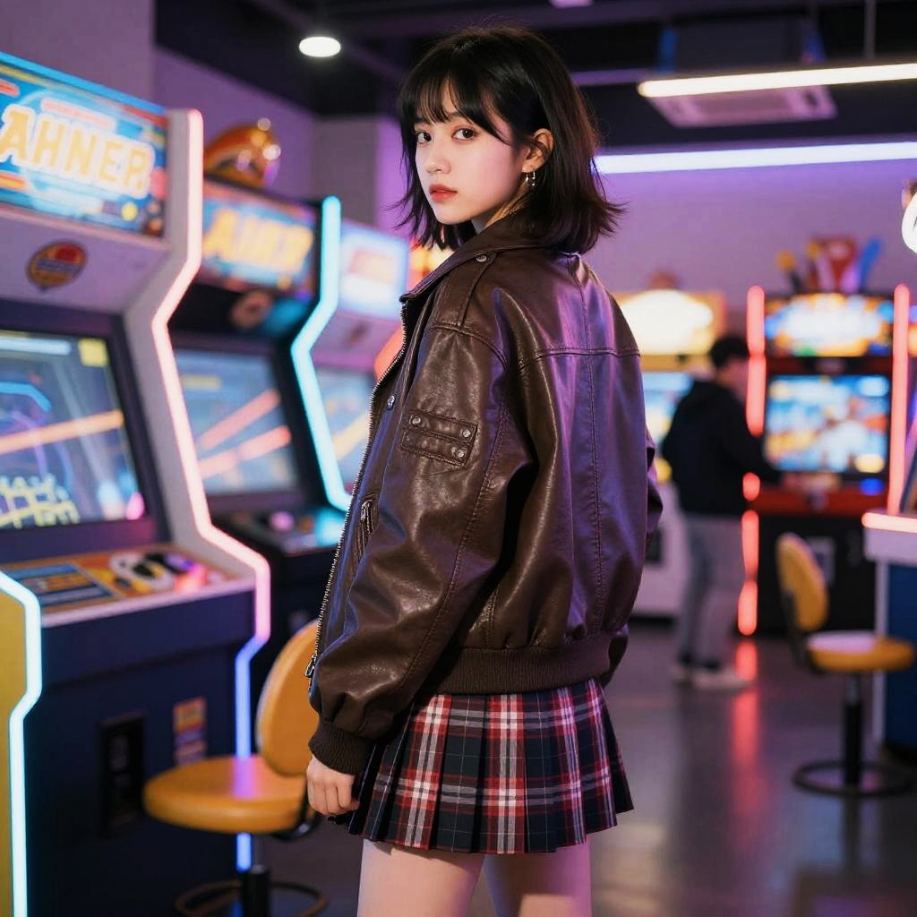 In a neon-lit arcade, a punk teenage girl wears oversized leather jacket and pleated plaid skirt. With her back facing the camera, she creates an intriguing scene.