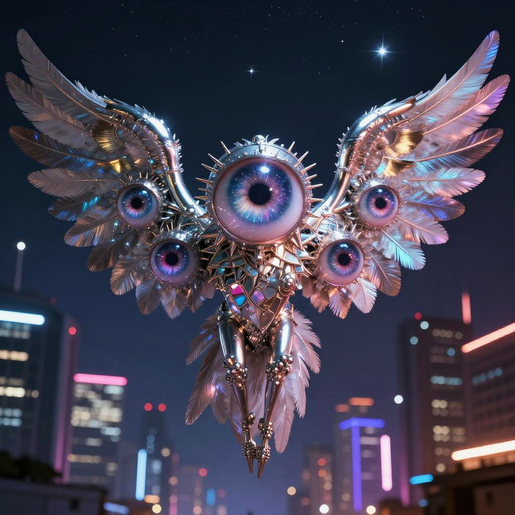 Multiple eyed angel in a futuristic cityscape, neon lights reflecting off metallic feathers, eyes shining with cosmic energy, dark sky with sparkling stars, cyberpunk vibe