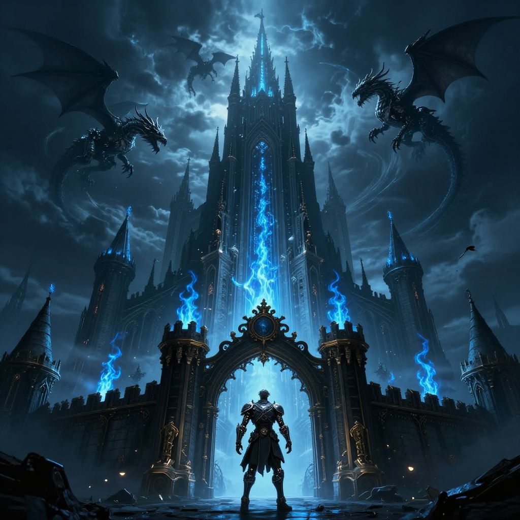 Fantasy spire ai: A towering, ancient spire made of crystalline stone rises into a stormy sky, glowing with ethereal blue and violet energy. Floating runes and bioluminescent vines wrap around its base. Mist swirls around the base, and a mysterious light pulse emanates from the top, as if it holds dormant arcane power. A lone knight in ornate armor stands at the base, looking up with awe and reverence.