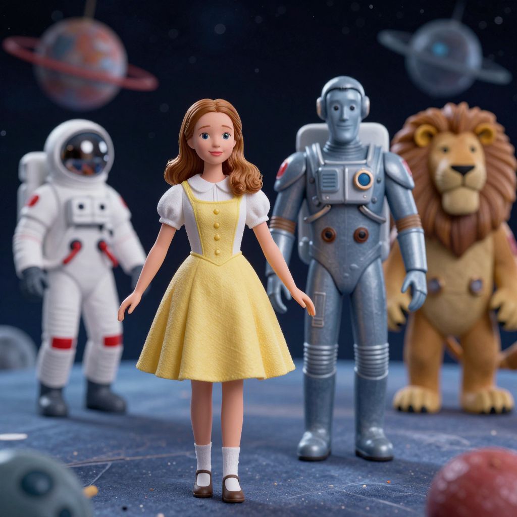 Photograph of CGI Alice in Wonderland dolls in blue, red, and green dresses, standing on circular platforms in a brightly lit exhibit room with colorful,