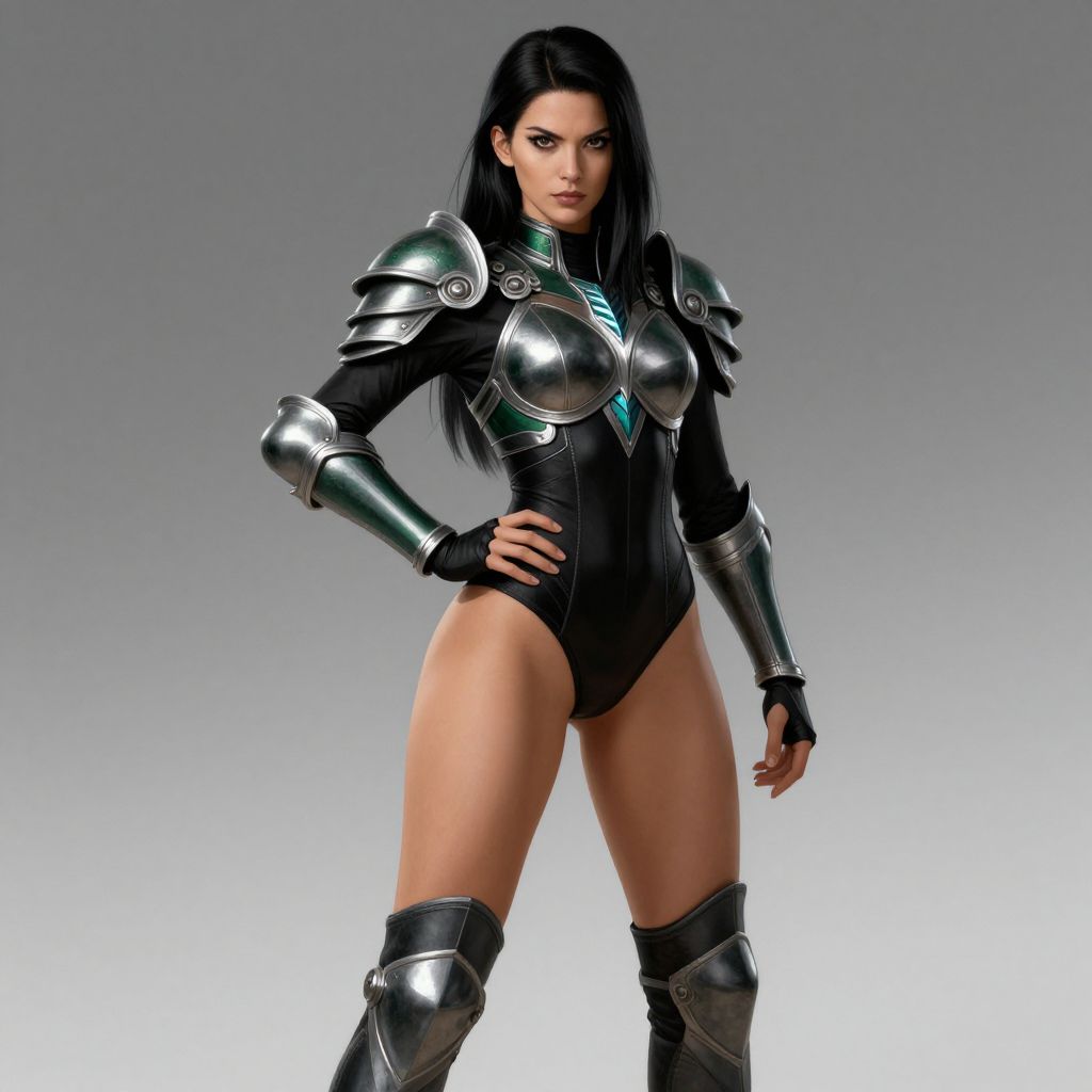 Photorealistic CGI image of a strong, attractive woman with long black hair and light skin. She wears a sleek, black, high-neck bodysuit with metallic silver shoulder and arm armor, and matching thigh-high boots. Her outfit accentuates her toned physique and medium-sized breasts. She stands confidently with one hand on her hip, gazing intently forward. The background is a simple, gradient gray, highlighting her warrior-like appearance. The metallic armor has a shiny, reflective surface, contrasting with the matte black bodysuit. Her expression is determined and fierce.
