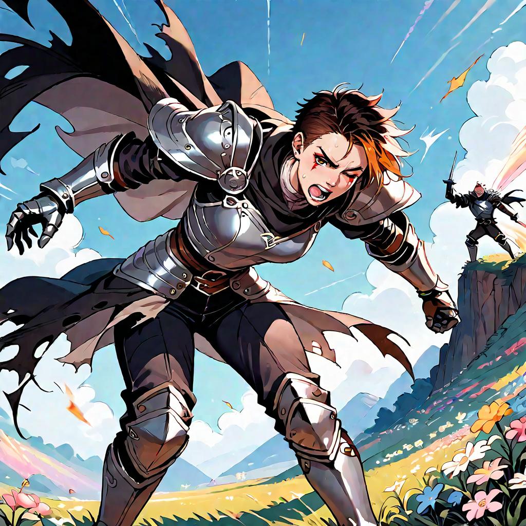 Score_9, score_8_up, score_7_up, source_anime, IncrsPunchMeme, incoming punch, motion blur, Guts_Armor, brown eyes, short hair, multicolored hair, spiked hair, scar on nose, scar, one eye closed, muscular male, black armor, shoulder armor, gauntlets, greaves, bandaged arm, black cape, torn cape, medieval, cloudy sky, sunlight, outdoors, grass, flower field, open mouth, shouting, teeth, screaming, angry, furious